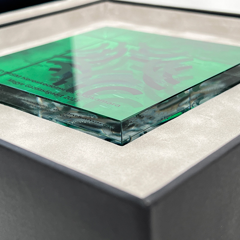 Az épített díszdoboz készítésekor ugyanolyan gondossággal és figyelemmel dolgozunk, mint az üvegdíjak esetében, biztosítva, hogy a doboz kialakítása harmonizáljon a díj formájával és stílusával. Legyen az anyaga papír vagy fa, a díszdoboz maga is mestermunka.